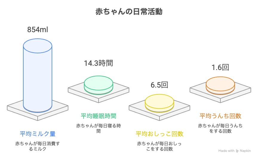 - 平均ミルク量:854ml/日(平均回数 4.8回/日)